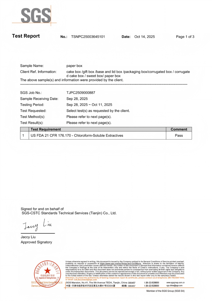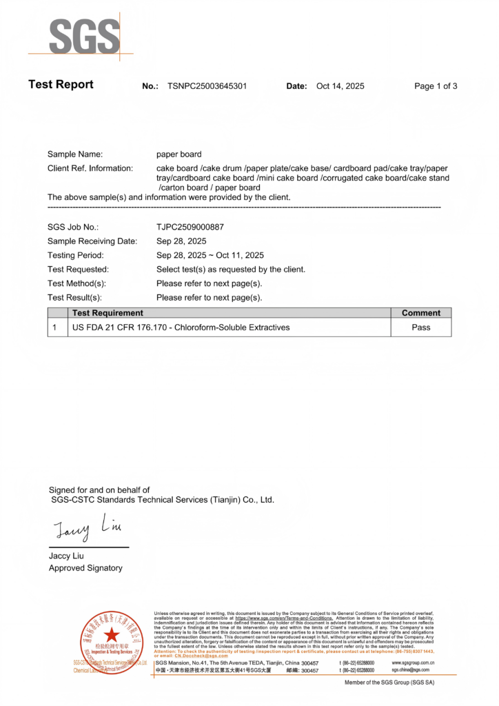 Our cake boards have successfully passed the stringent SGS inspection, testing, certification, and identification processes, ensuring an excellent product quality. Our boards excel in cake presentation, durability, reliability, and environmental protection, meeting the highest standards. You can confidently use and purchase our cake boards.